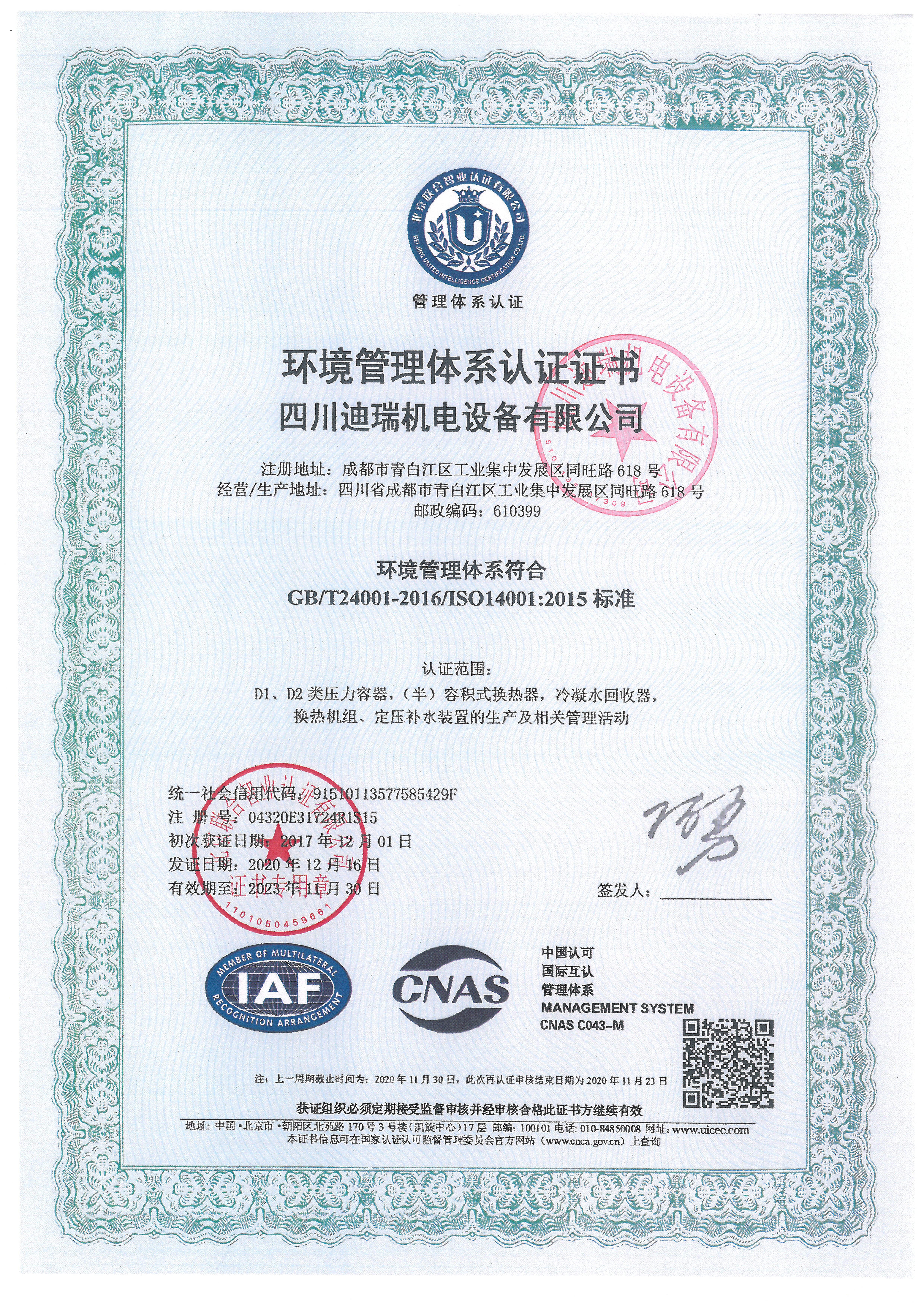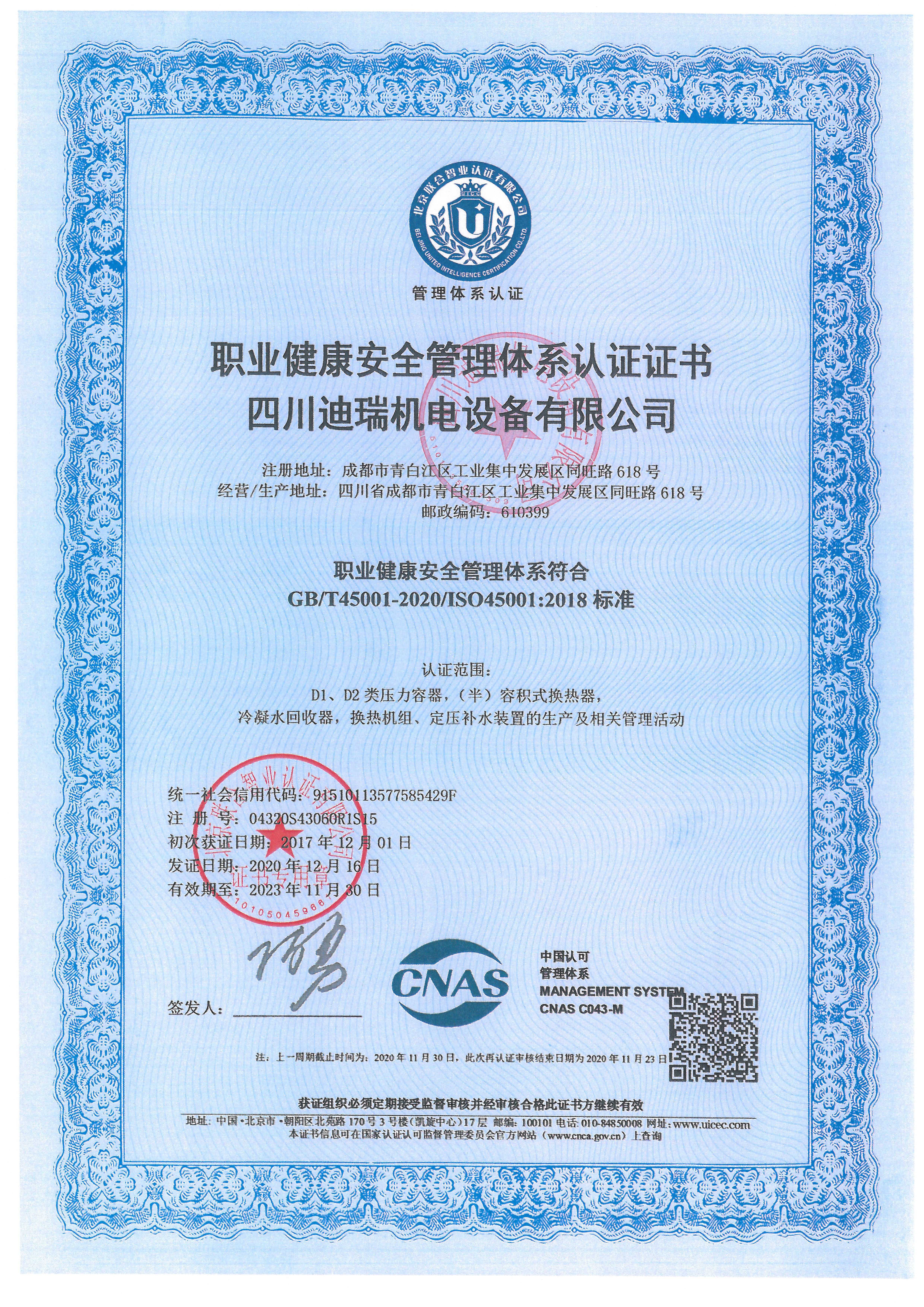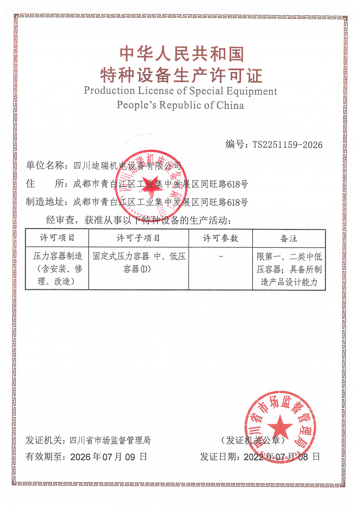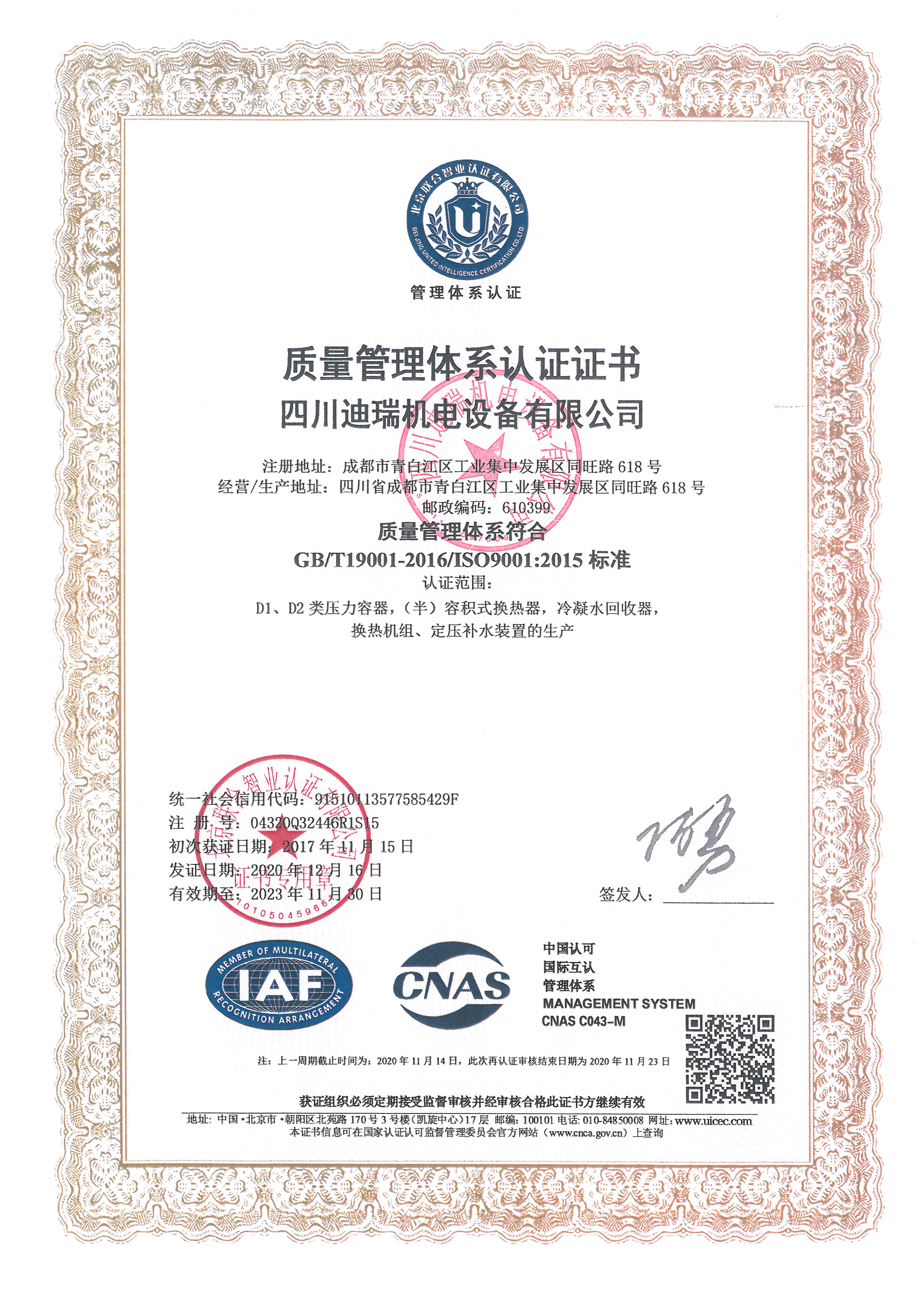 企業(yè)奉行“用戶至上、優(yōu)質(zhì)服務、持續(xù)改進”的宗旨,不斷改進產(chǎn)品結(jié)構(gòu),提升產(chǎn)品性能,并與西安交通大學能源與動力工程學院建立產(chǎn)學研合作,取得8項實用新型專利,正在申報一項發(fā)明專利。企業(yè)通過D1、D2類壓力容器制造許可認證和ISO9001質(zhì)量管理體系認證,被評為成都市擬上規(guī)企業(yè)、成都市專特新精企業(yè)和大中華區(qū)酒店工程師協(xié)會最佳合作單位。